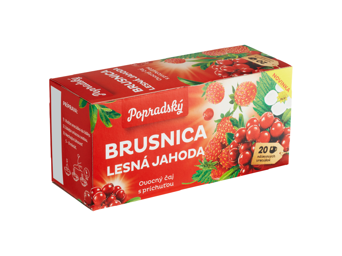 - Aromatizovaný ovocný čaj s príchuťou brusnica, lesná jahoda, porciovaný v nálevových vreckách