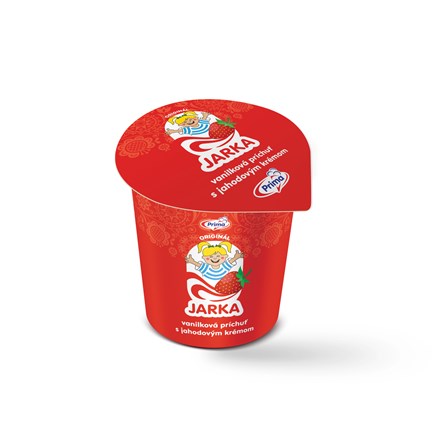 - Mrazený krém s rastlinným tukom s vanilkovou príchuťou a jahodový krém s jahodovým toppingom.