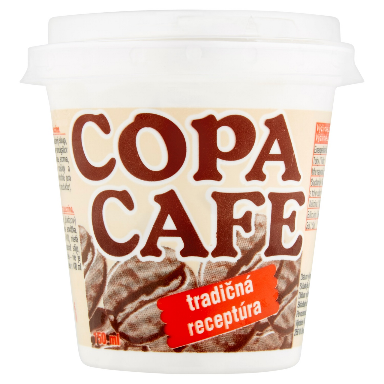 - Obnovené odstredené MLIEKO, pitná voda, cukor, kokosový olej, glukózový sirup, sušená srvátka, emulgátor: mono- a diglyceridy mastných kyselín, stabilizátory: guarová guma, karobová guma, 0,15% mletá káva, farbivo: amoniak-sulfitový karamel, arómy. Môže obsahovať SÓJU, arašidy a orechy. Obsahuje kofeín – nie je vhodné pre deti a tehotné ženy (4,5 mg kofeinu v 100 g výrobku)