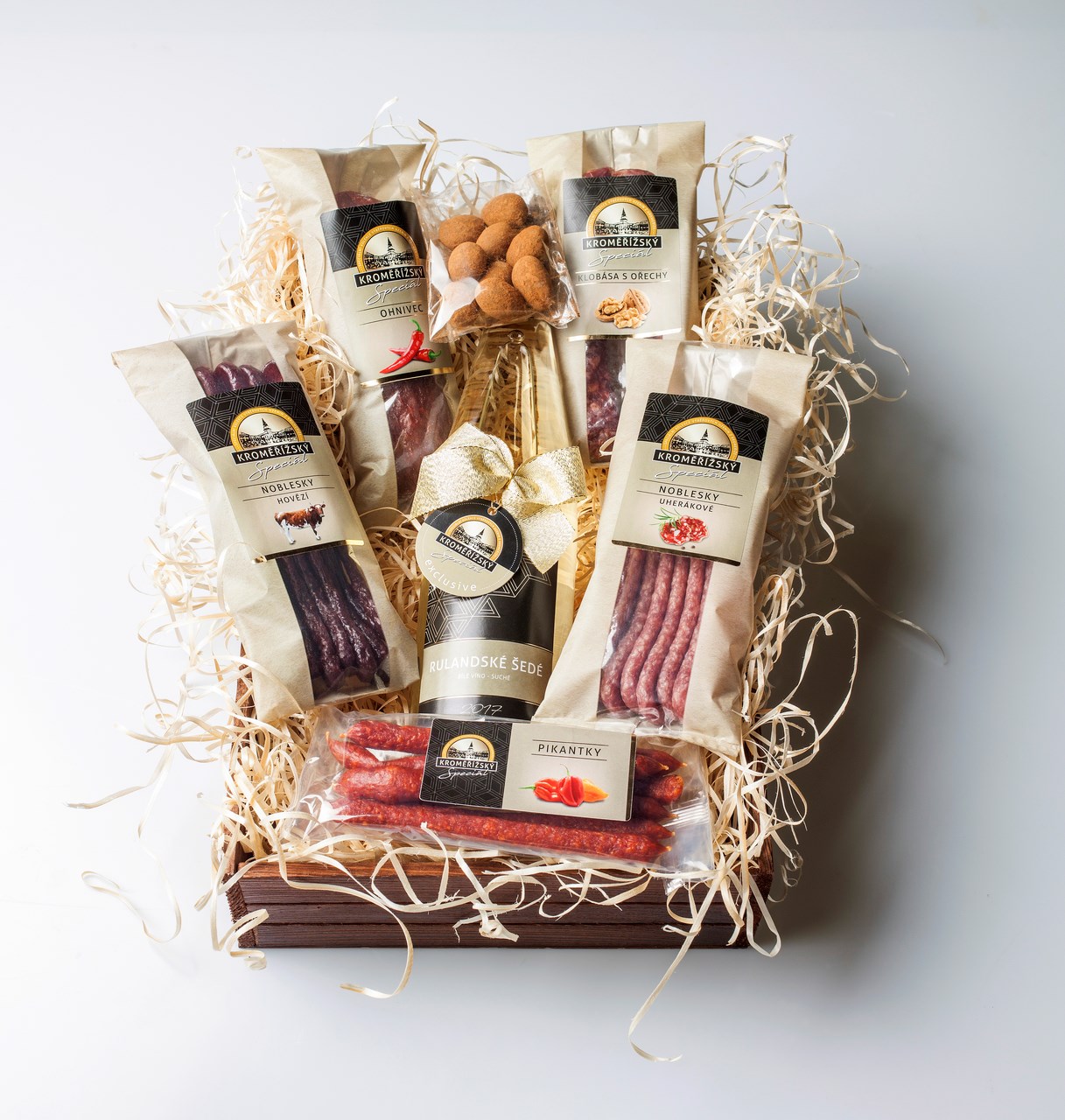 - Exkluzívne darčekové balenie trvanlivých výrobkov v elegantnej drevenej bedničke. Bednička obsahuje pikantný salám Ohnivec, klobásku s lieskovými orechmi a jemne pikantné paprikové klobásky Pikantky. Kolekciu završujú jalapeňo a uherákové Noblesky . To všetko doplňuje biele akostné víno Rulandské šedé 0,75l a mandle v čokoláde a škorici.
