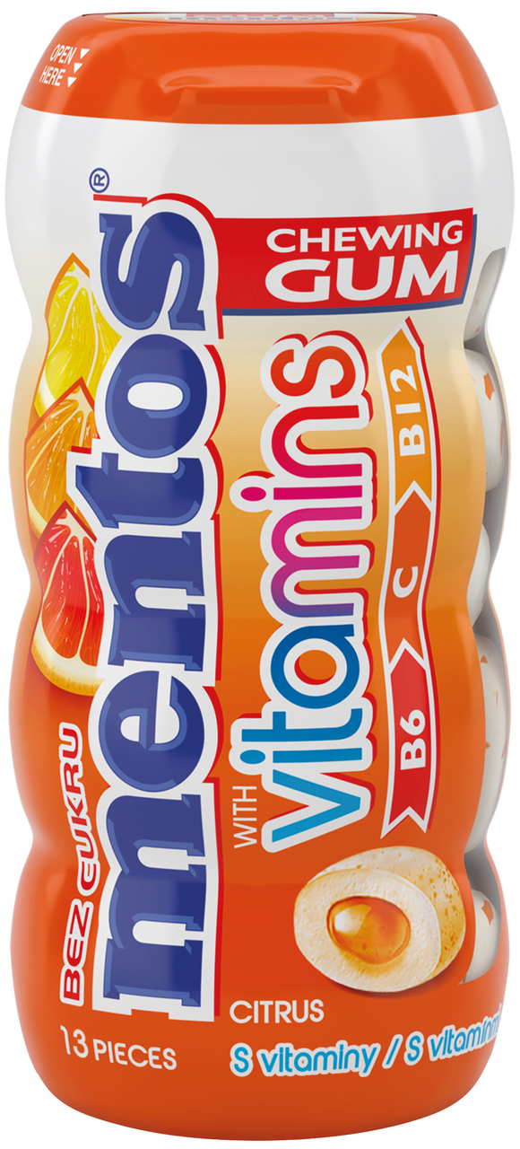 - Dražovaná žuvačka s tekutou náplňou 6,5 % s citrusovou príchuťou. S vitamínmi C, B6, B12. Obsahuje sladidlá.