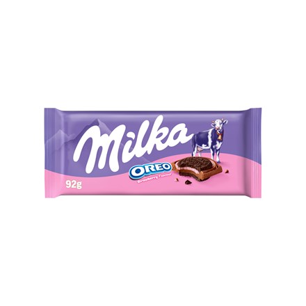 - Kakaové sušenky (26 %) a náplň (9,5 %) s jahodovou příchutí v mléčné čokoládě z alpského mléka.