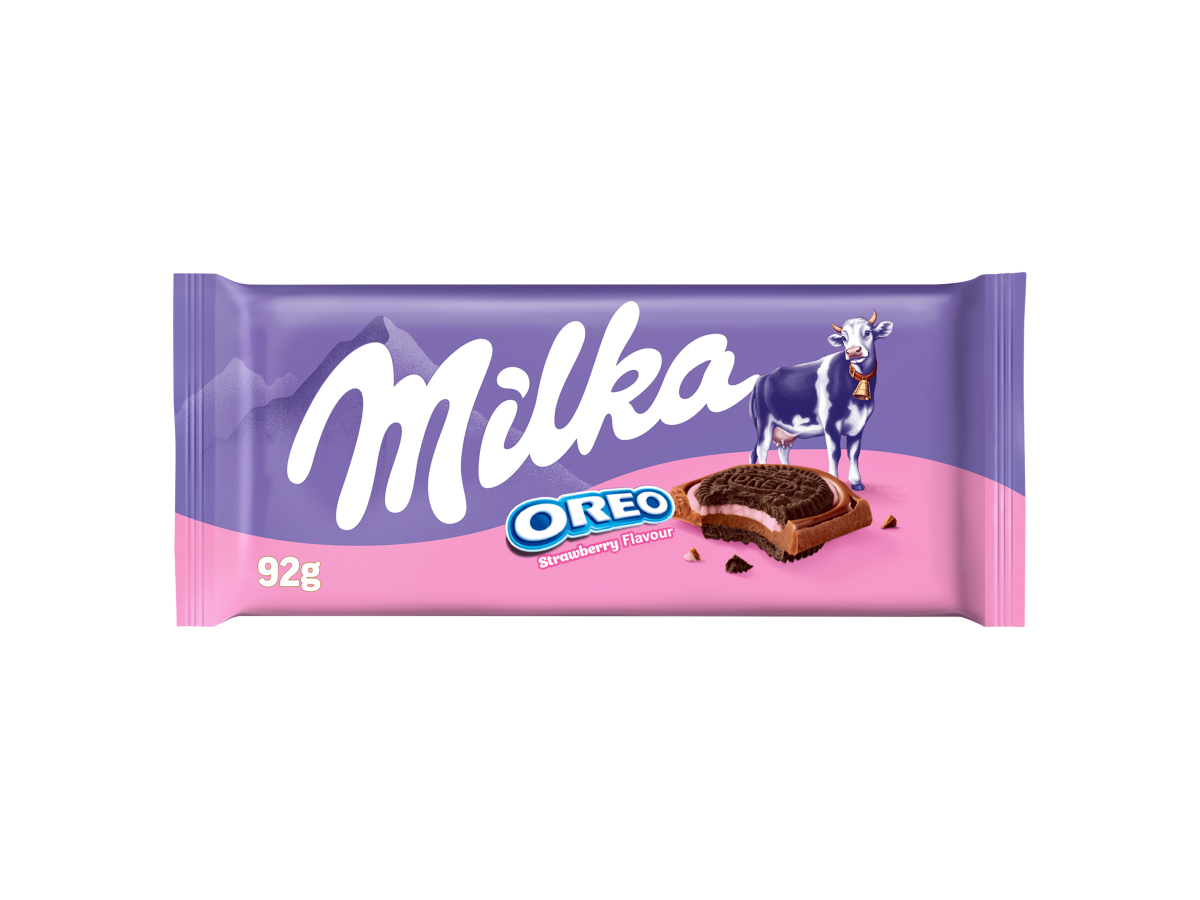 - Kakaové sušenky (26 %) a náplň (9,5 %) s jahodovou příchutí v mléčné čokoládě z alpského mléka.