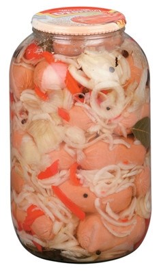 - špekačky (bravčové a hovädzie mäso min. 63%,bravčová slanina,voda,bravčové kože,zemiakový škrob,jedlá soľ,korenie,stabilizátory:E250, E451, aróma;bielkovina živočíšného povôdu,zahusťovadlo E412,E415;antioxidant E316,E300,extrakty korenín,sušená zelenina,glukózový sirup,farbivo karmína, cesnak),cibuľa,kápia,feferóny,voda,sladidlo sukralóza,nové korenie,bobkový list,čierne korenie,konzervačné látky: kyselina mliečná a octová.